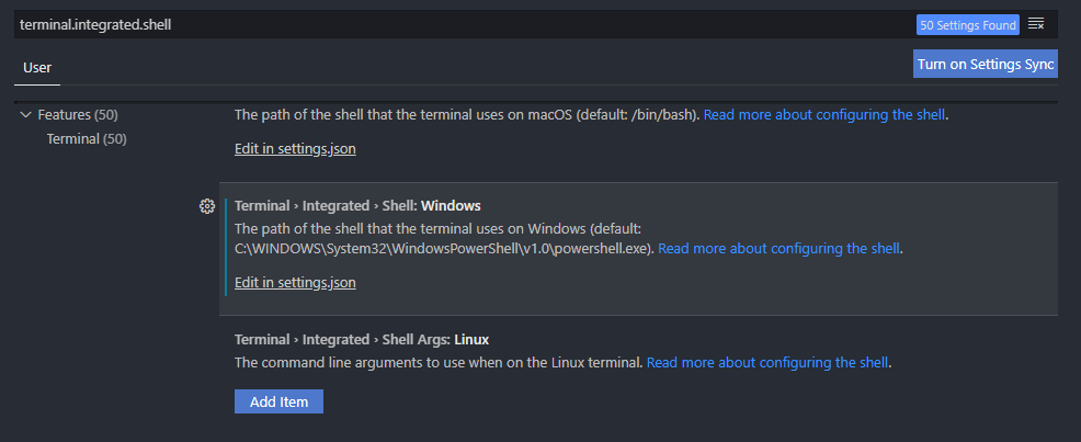 2. terminal.integrated.shell 을 검색해서 Edit in settings.json을 누릅니다.